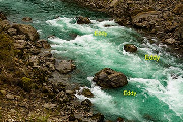 An ‘eddy’ is an area of calm or reverse circulating water on the opposite side of the obstruction. Paddlers can use eddies to rest or work their way up or down a river linking eddies together. Eddies can occur in light or fast current.
