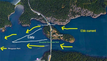 In Deception Pass there’s spots such as behind Pass Island where on the ebb, we can paddle up the eddy several hundred feet with current flowing in the opposite directions on both sides.