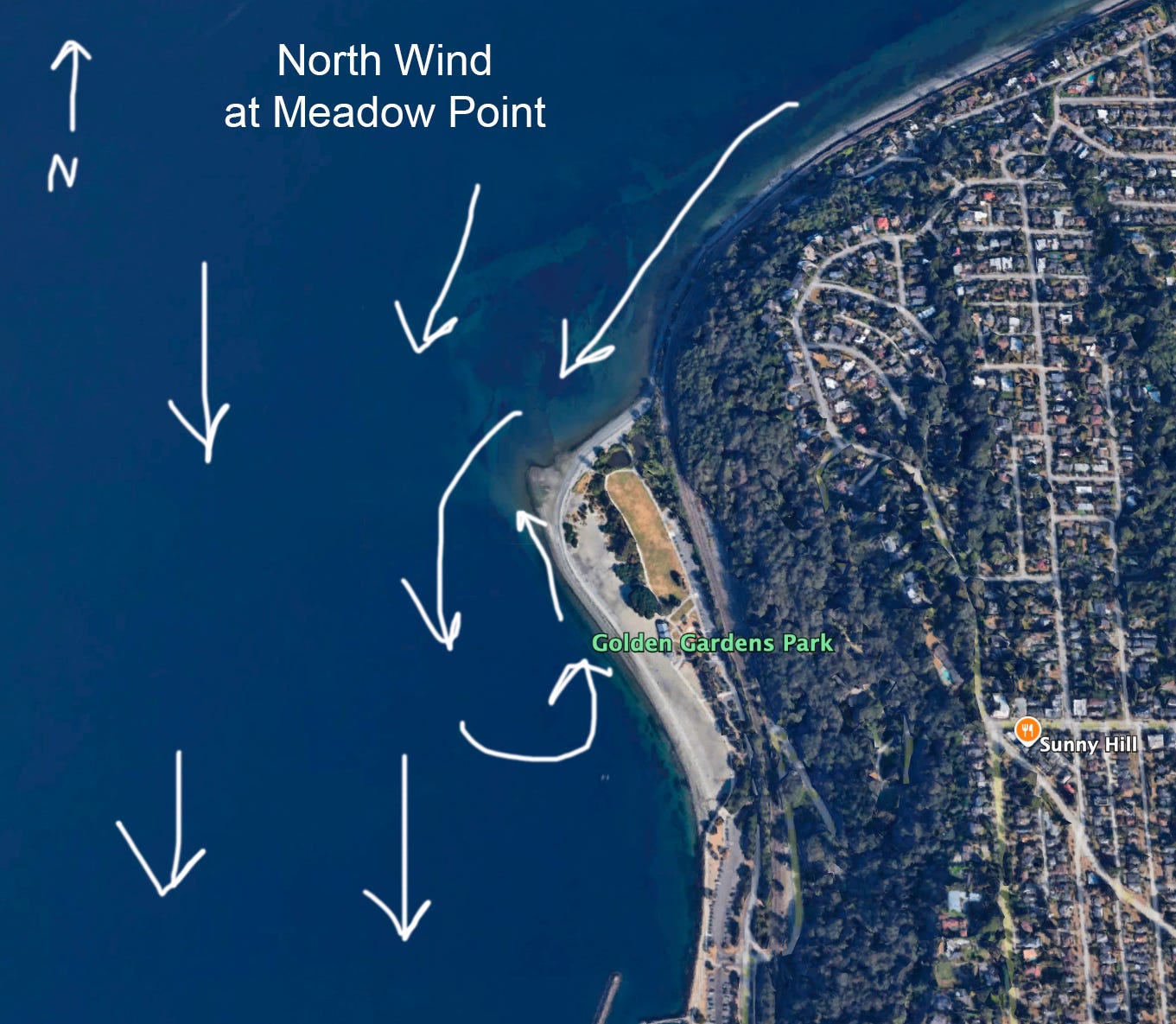 Another interesting effect – The other day I was surfing wind waves at the point on the ebb. Strong ebb current backed by a 20-knot southerly was flowing along the south shore from Discovery Park to the point thus pushed me straight out into the Sound instead of wrapping around the point.